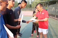 党委书记程新,教师代表和2018届毕业生代表及部分网球爱好者参与其中。比赛中全体运动员朝气蓬勃、顽强拼搏的精神为我们带来了一场场精彩的视觉盛宴。经过三天50多场的激烈角逐,由程新、张娜、边建、耿冰、葛曷一组成的教工组战胜由林放、李旭尧、林宪法、张蒙、肖春梅组成的学生组获得团体赛冠军,林放荣获男子单打冠军;林放、李旭尧荣获男子双打冠军;林放、肖春梅荣获混合双打冠军。