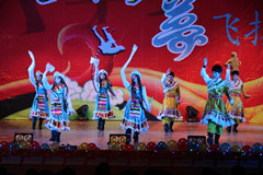 晚会的第二篇章‘永恒博大篇——蓝之博’在中华民族传统的太极扇表演中展开。伴随着悠扬的音乐,同学们动静结合、刚柔快慢,挥洒自如,充分展示了“无极生太极,太极生两仪,两仪生四象,四象生八卦”的太极文化。优雅大方的太极扇表演舞动着全场的节奏,表演中尽展了大学生的青春风采;将灿若星河的中华武术展现的淋漓尽致。接下来的歌曲串烧中,演员们更是以其精湛的唱功征服了在场的观众,粤语的激情与青春的活力更是达到了完美的融合。藏舞表演《雪域锅庄》中,藏族小伙的狂野与西域妹子的柔媚相结合,以其曼妙地舞姿渲染出浓厚的异域氛围。小品《监考老师》则笑料百出,令人捧腹,演员们则以其诙谐幽默的语言和搞笑的表情征服了观众,叫好声此起彼伏。紧随其后的爵士舞表演《Dancing queen》中,only舞社则以其激情四射的绚丽表演点燃整个会场的气氛。