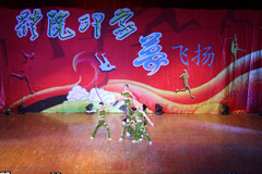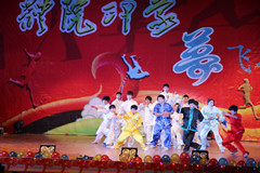 杨鹏老师领演的健美操《舞动青春》充满青春气息,又不失诙谐幽默,将晚会推向了另一个高潮。武术表演《体院武魂》一队队小伙子身穿红色武术服,手持大刀冲进舞台,其虎虎生风的大刀表演,集体拳术的套路表演,节目之精彩、气势之雄伟、使得在场观众直呼“给力”。有人说“每个中国人心中都有一个武侠梦”而这次华丽的武术表演则以一种独特方式圆了在场所有人的“武侠梦”,更是把我体院学子的活力、青春、健美展现的淋漓尽致。最后,晚会在一曲深情款款的师生大合唱《相亲相爱》中圆满落下帷幕。