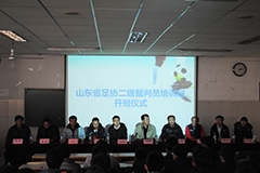 院长杨磊主持,足管中心隋建明副主任在开班仪式上致词。他指出,此次培训得到了济南市足球运动管理中心大力支持和帮助,足管中心领导的充分重视,本次培训是山东足协为适应山东足球竞赛运动和校园足球运动的发展,加强足球竞赛裁判人才培养的重要举措。并从多个方面讲解了现代足球给大家带来的意义和乐趣,指引大家正确地去认识和认知足球。希望通过此次培训来切实提高足球裁判员的职业道德水平和现场执裁能力,让更多的足球爱好者投身到足球运动当中,在加强足球竞赛规则系统学习的同时,发现裁判苗子并跟踪培养,为山东足球裁判员担任高水平比赛执裁工作做好人才输送。