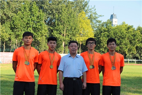 图4:校党委朱德强副书记与获得男子乙组4*400米接力冠军的队员合影