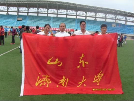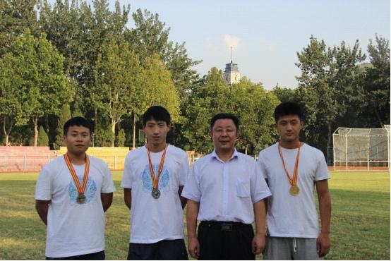 十九、获得女子乙组100m和200m两枚银牌的姜少霞同学(左)、获得男子乙组110m栏银牌和400m栏铜牌的李良杰同学(右一)与教练员李保安副教授(中)合影