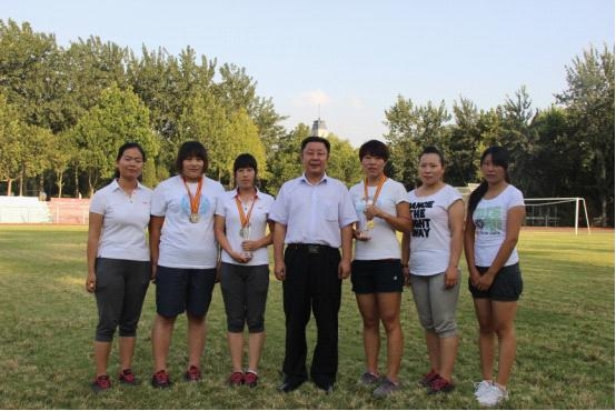 三、代表团团长校党委副书记朱德强同志与获得女子乙组团体第三名的女运动员合影