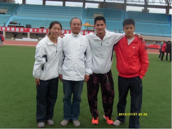 二十、获得女子乙组七项全能冠军的胡月同学(左一)、获得男子跳高第四名的孙浩同学(左三)、获得男子乙组跳远第六名和110m栏第七名的初庆准同学(右一)与教练员李万松副教授(左二)合影